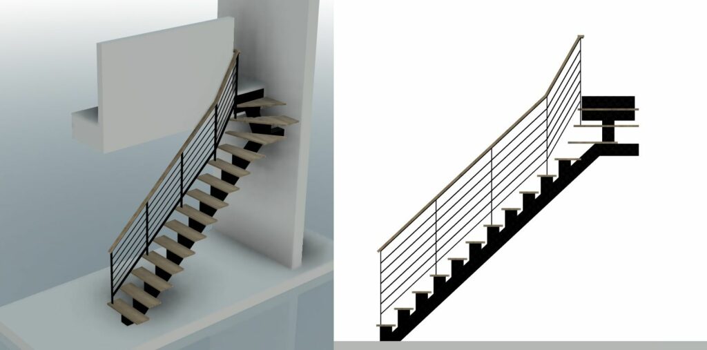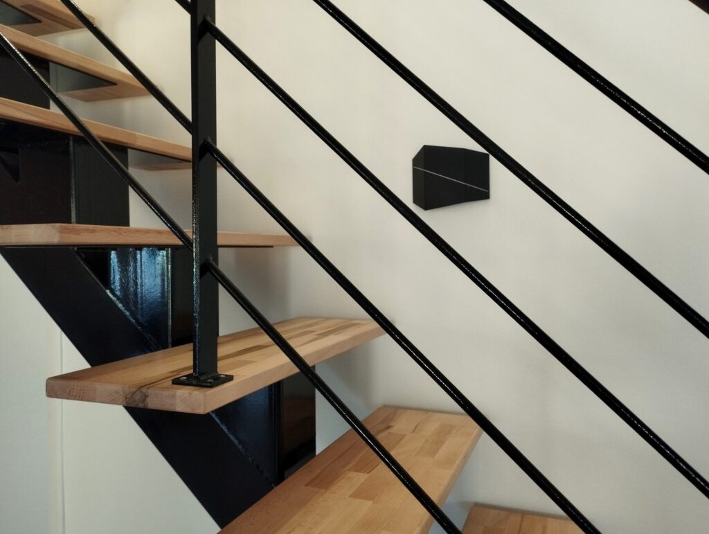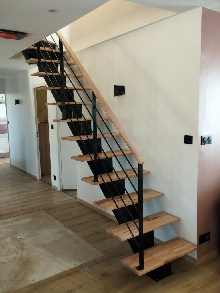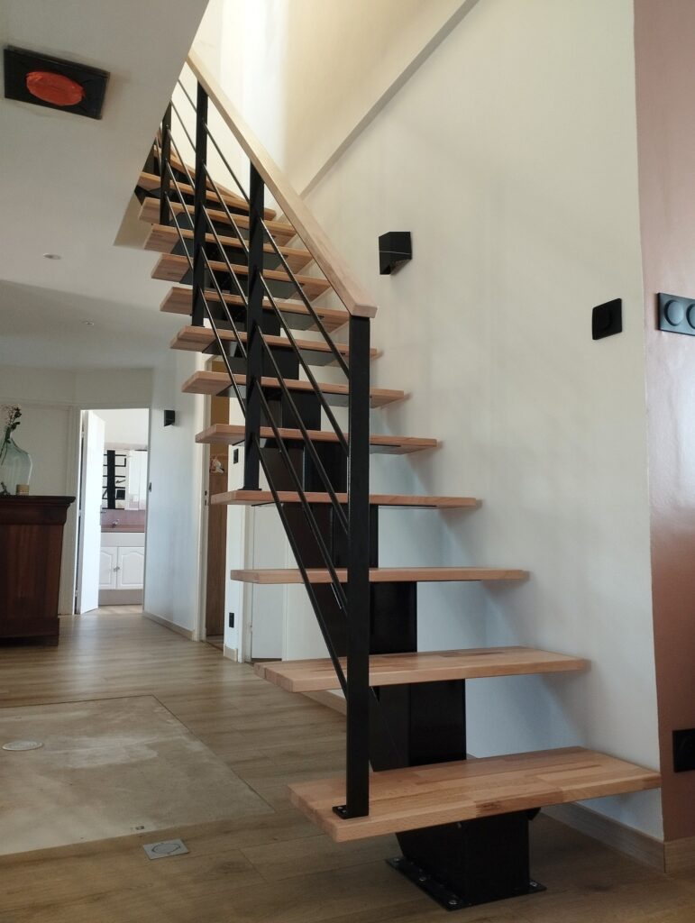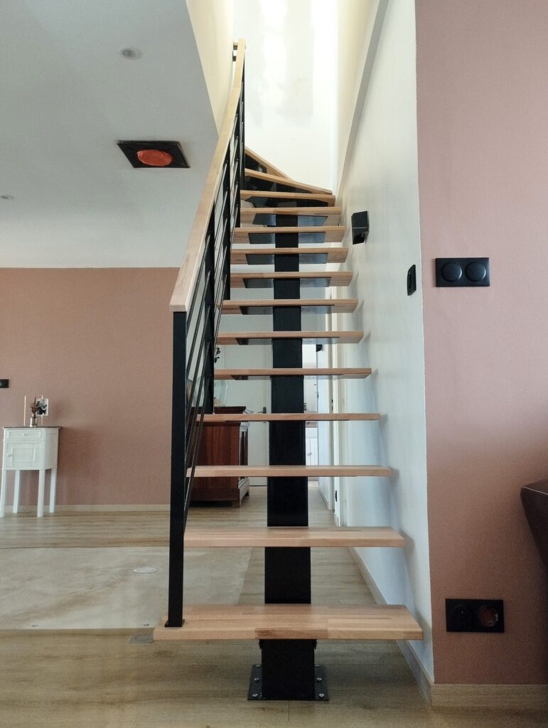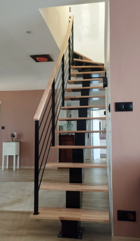 Limon en acier de 15cm par 15cm, marches et main courante en hêtre