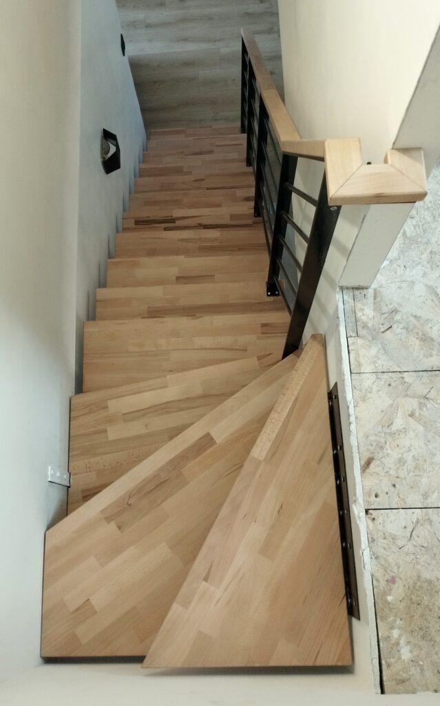 Cet escalier droit est balancé sur les 4 dernières marches afin de rejoindre le palier situé sur la gauche.
